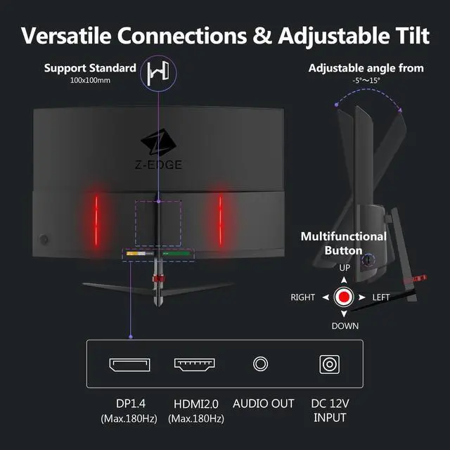 Z-EDGE 27 inch 1920 x 1080 Full HD 180 Hz 1 ms Curved Gaming Monitor, HDMI 2.0, DP 1.4, Supports Wall Mount