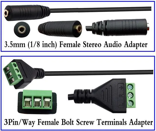 FeaturesDIY(1/8 Inch) 3.5mm Stereo Audio Female to 3 pin (way) Bolt Screw Terminal Type Block Connector Cable (Stereo Audio to screw teminals