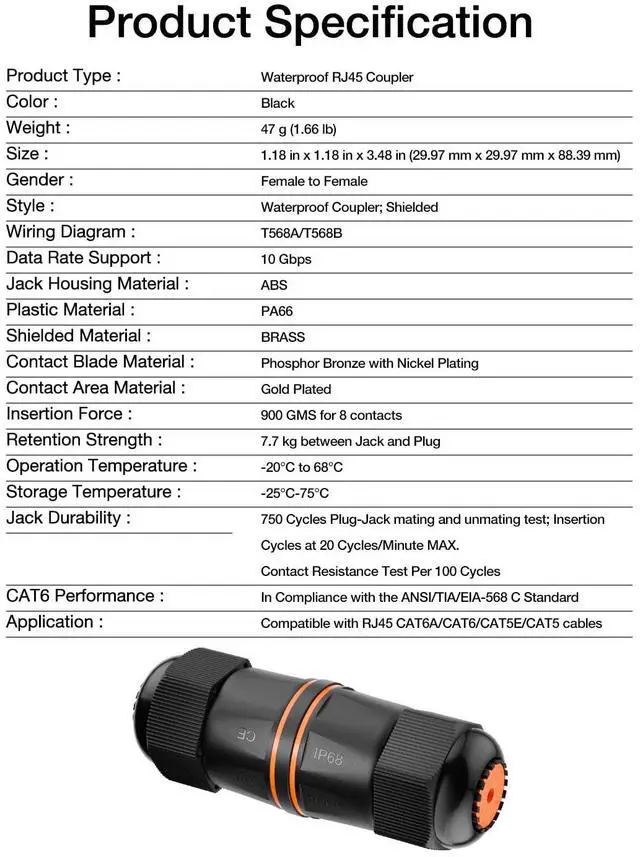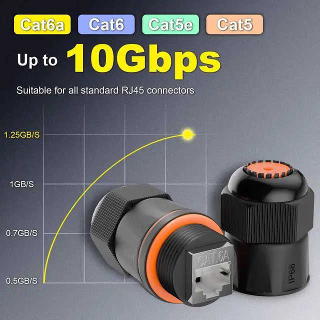 Cat6a specification supports maximum 10Gbps signal transmission speed and are back compatible with Cat6/5e/Cat5 ethernet cables. Perfect solution for outdoor equipment like IP camera, CCTV to prevent water penetration.