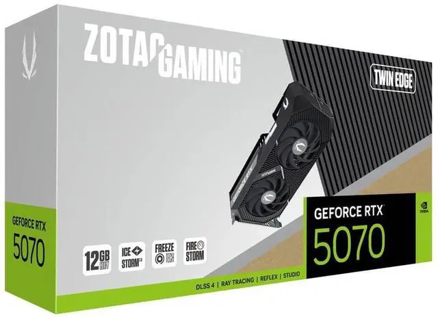 | Package Contents | INSIDE THE BOX • ZOTAC GAMING GeForce RTX 5070 Twin Edge OC • User Manual • 2 x 8-pin-to-16-pin cable |