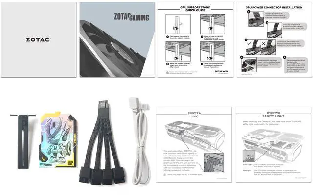Packaging| Package Contents | INSIDE THE BOX • ZOTAC GAMING GeForce RTX 5090 SOLID OC • User Manual • 4 x 8-pin-to-16-pin cable • SPECTRA LINK cable • GPU Support Stand |